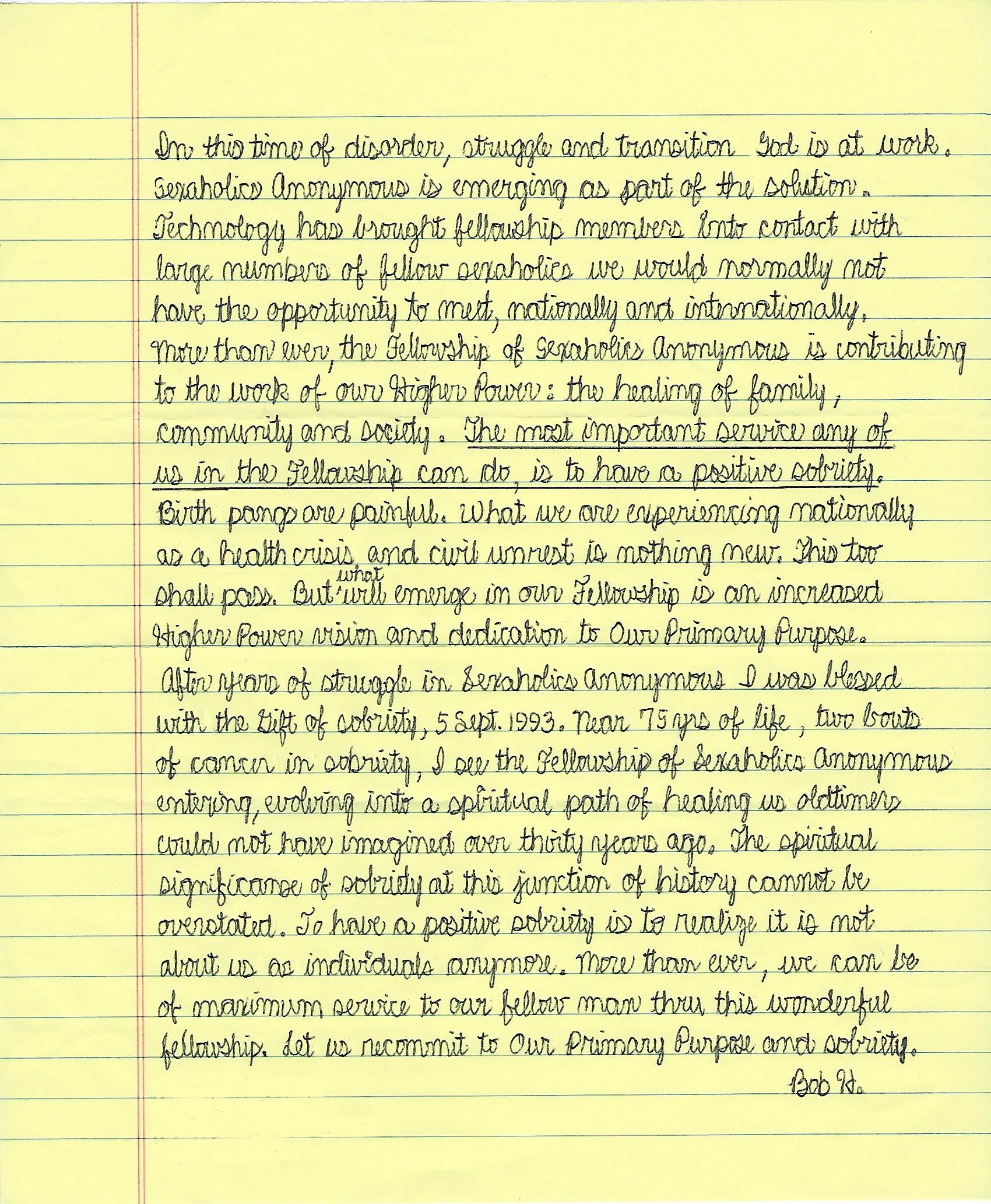After years of struggle in Sexaholics Anonymous I was blessed with the Gift of sobriety, 5 Sept. 1993. Near 75 yrs of life, two bouts of cancer in sobriety, I see the Fellowship of Sexaholics Anonymous entering, evolving into a spiritual path of healing us oldtimers could not have imagined over thirty years ago. The spiritual significance of sobriety at this junction of history cannot be overstated. To have a positive sobriety is to realize it is not about us as individuals anymore. More than ever, we can be of maximum service to our fellow man thru this wonderful fellowship. Let us recommit to Our Primary Purpose and sobriety.