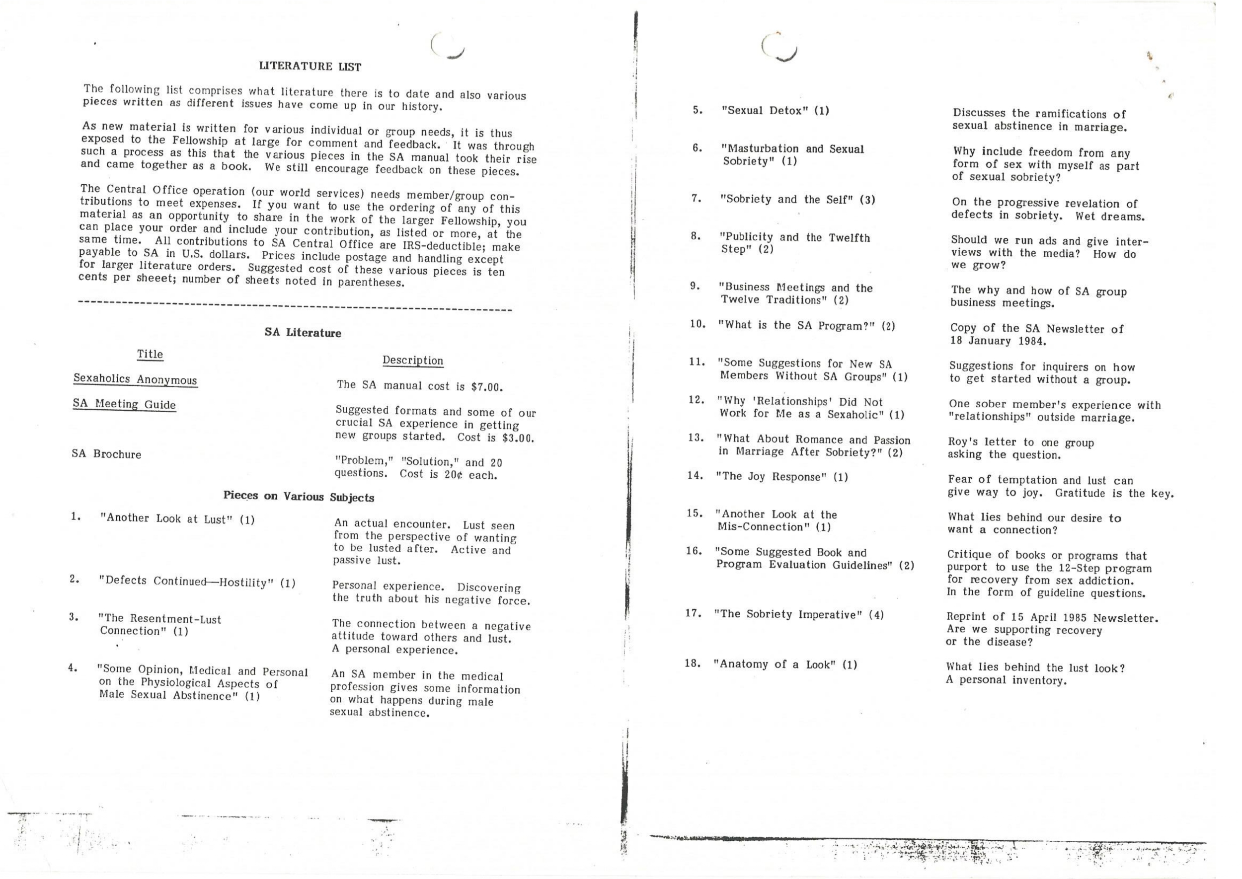 The newly-revised Meeting Guide is now in two parts. One part, bound in a separate cover, contains suggested meeting formats and the standard readings used in meetings, such as portions of Chapters 3 and 5, A Vision for You, the 12 and 12, etc. The second part, also separately bound, contains Suggestions for New SA Groups, Meetings—How They Work, What is the SA Program (18 January 1984 letter), and the paper, “Publicity and the Twelfth Step.” Price is still $3.00.