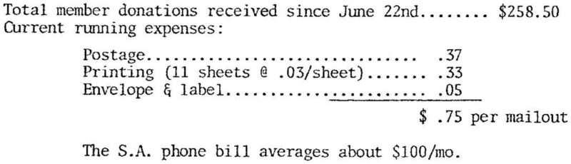 Some members have suggested we should tell everybody what the financial picture is at the General Service Office (formerly called SA Central), so here goes. First, everyone should know that we’ve gone in for non-profit (charitable) tax-exempt organization status with the Internal Revenue Service. This means that all contributions to local SA groups and to SA General Service Office (GSO) are tax deductible. And once GSO gets its official exemption letter, we will go in with a letter listing all SA groups who want to be listed and get a Group Exemption Number, which can be noted on individual Income Tax Return Forms, officially legitimatizing all member contributions.